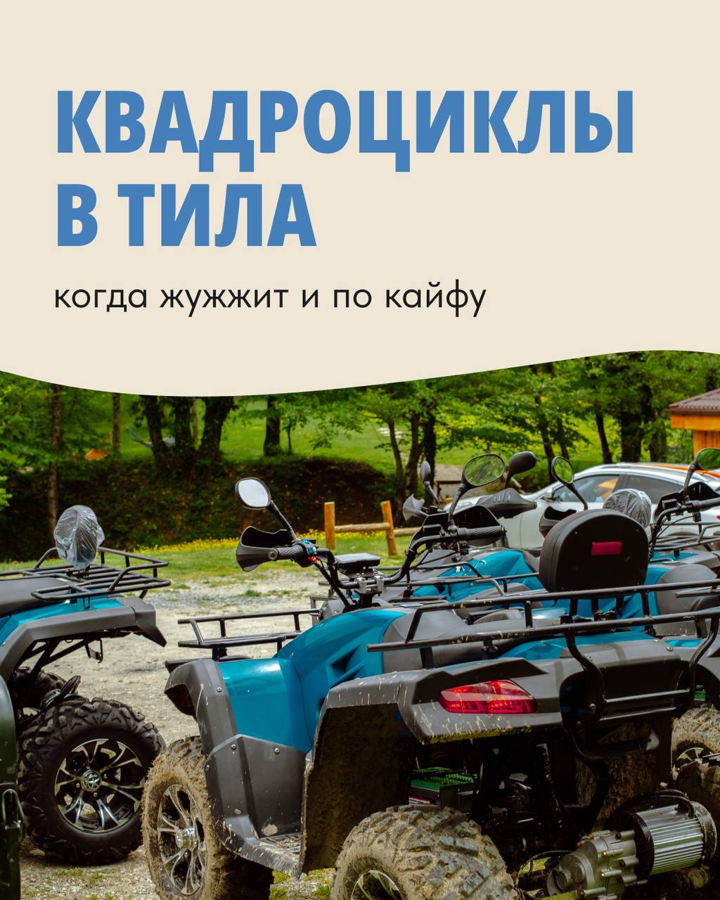 Включайте зажигание — впереди настоящая off-road трасса! Катание на квадроциклах — это драйв, скорость и свобода на лесных тропах. Преодолевайте ухабы и повороты, спуски и подъёмы с друзьями или всей семьёй на фоне природного ландшафта.